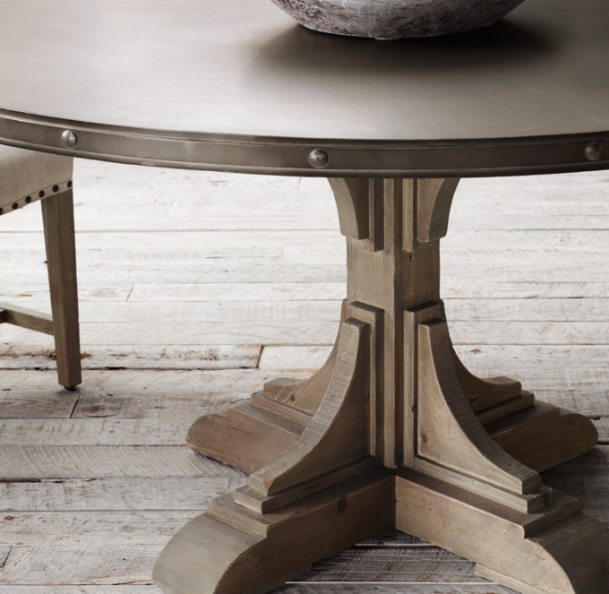Round Recycled Fir Dining Table / Restoration Hardware Salvaged Wood Trestle Round Dining Table | Chairish. Set up next to a maisons du monde corner sofa and sporting one of our snack trays full of cake (and perhaps even a nice cup of tea in a piece from one of our sets of mugs!), these exceptional designs will make the right kind of statement in your living space. Reclaimed wood, glass, white laminate, marble, teak, concrete and more. Gather round in rustically refined style with the dining table. Tabletop with a touch of wood grain detail makes the most of wood's natural variation. Table have champagne colored nail heads.